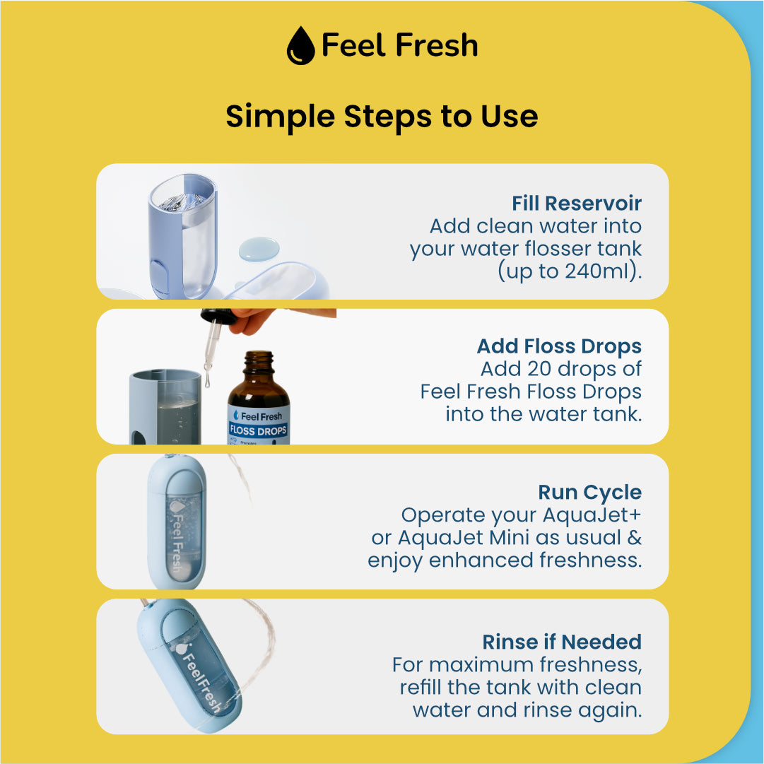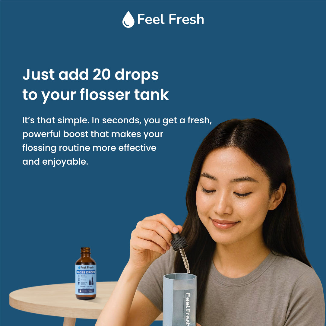 Simply fill your water tank, add 20 drops, and floss as usual. No extra rinsing required — just effortless freshness.