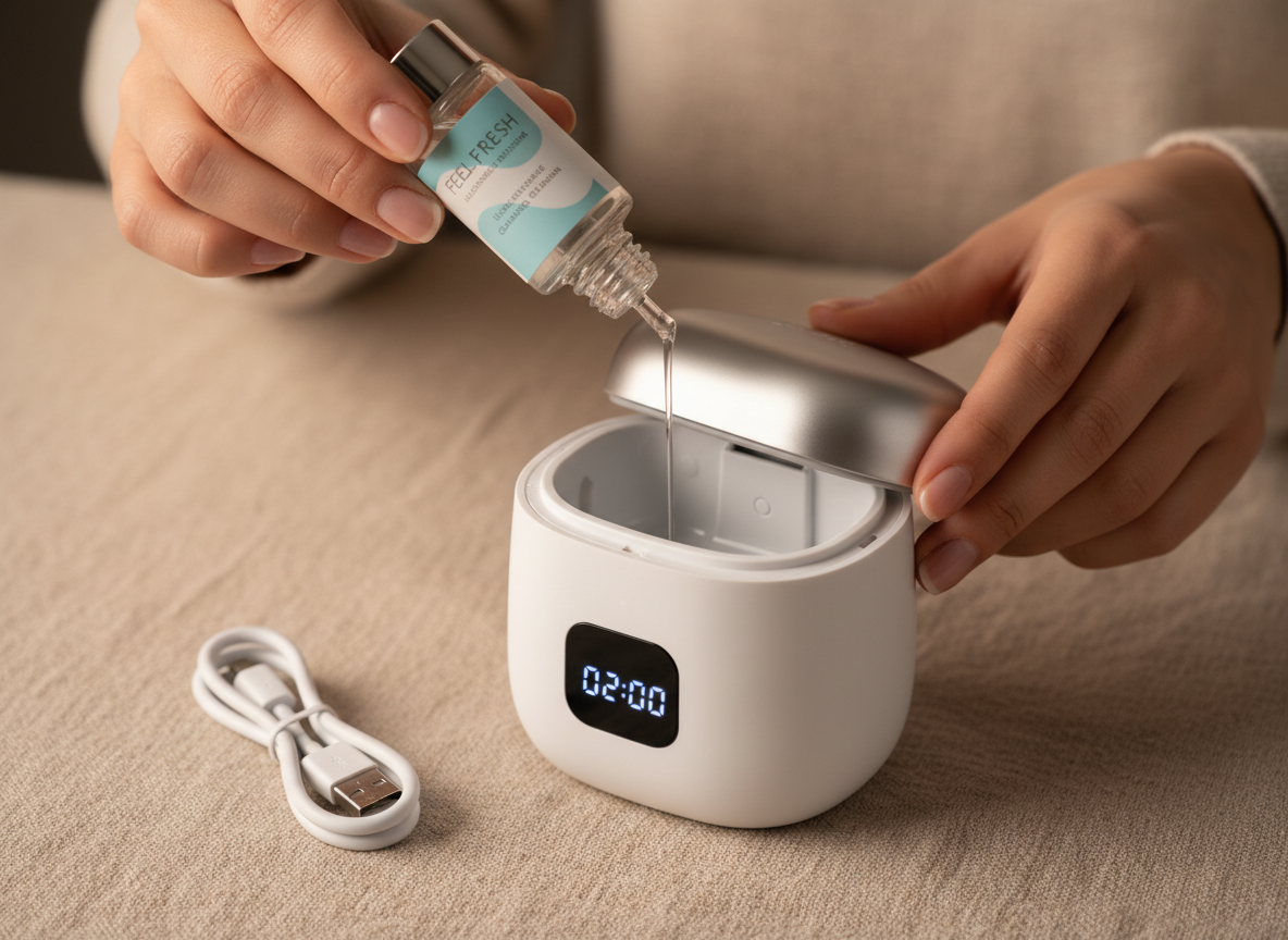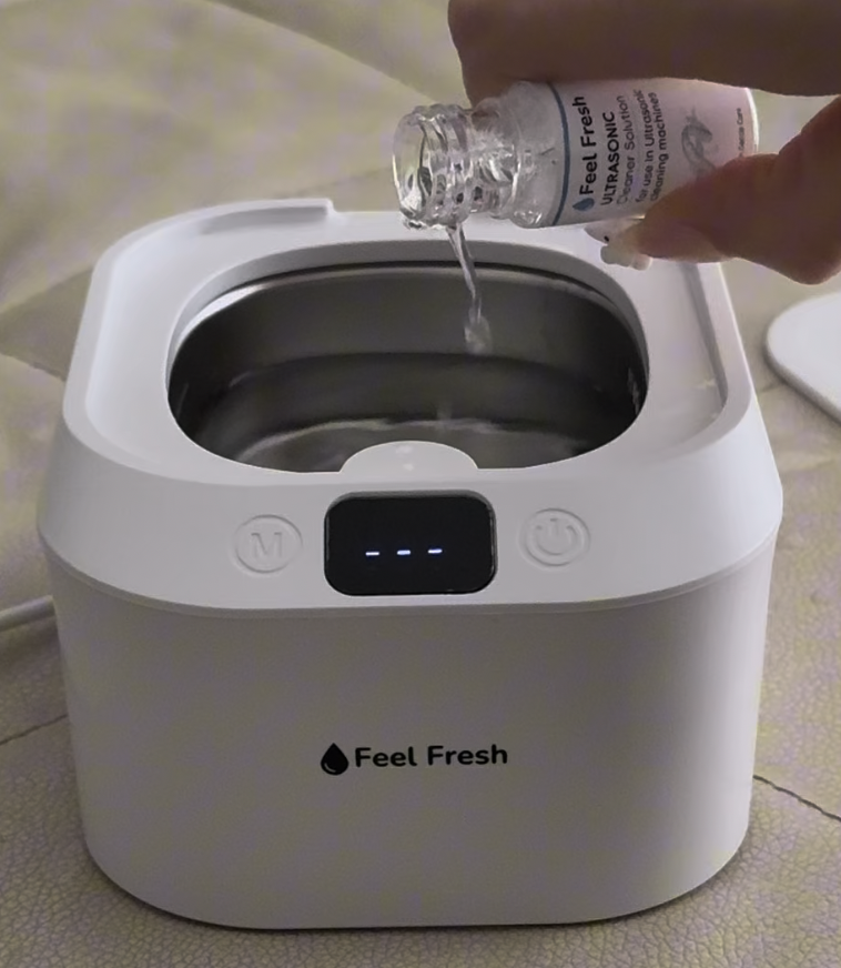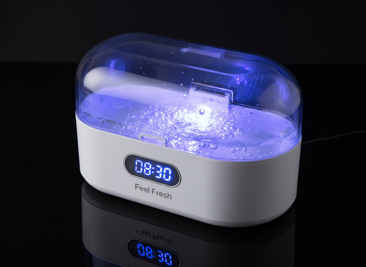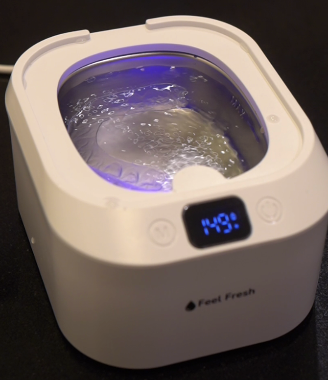 Cleaning tablets mainly work on the surface, helping to remove light stains and odor through soaking. Our ultrasonic cleaner uses 42,000 Hz vibrations to create micro-bubbles that penetrate deep to break apart stubborn buildup that soaking alone can’t remove.